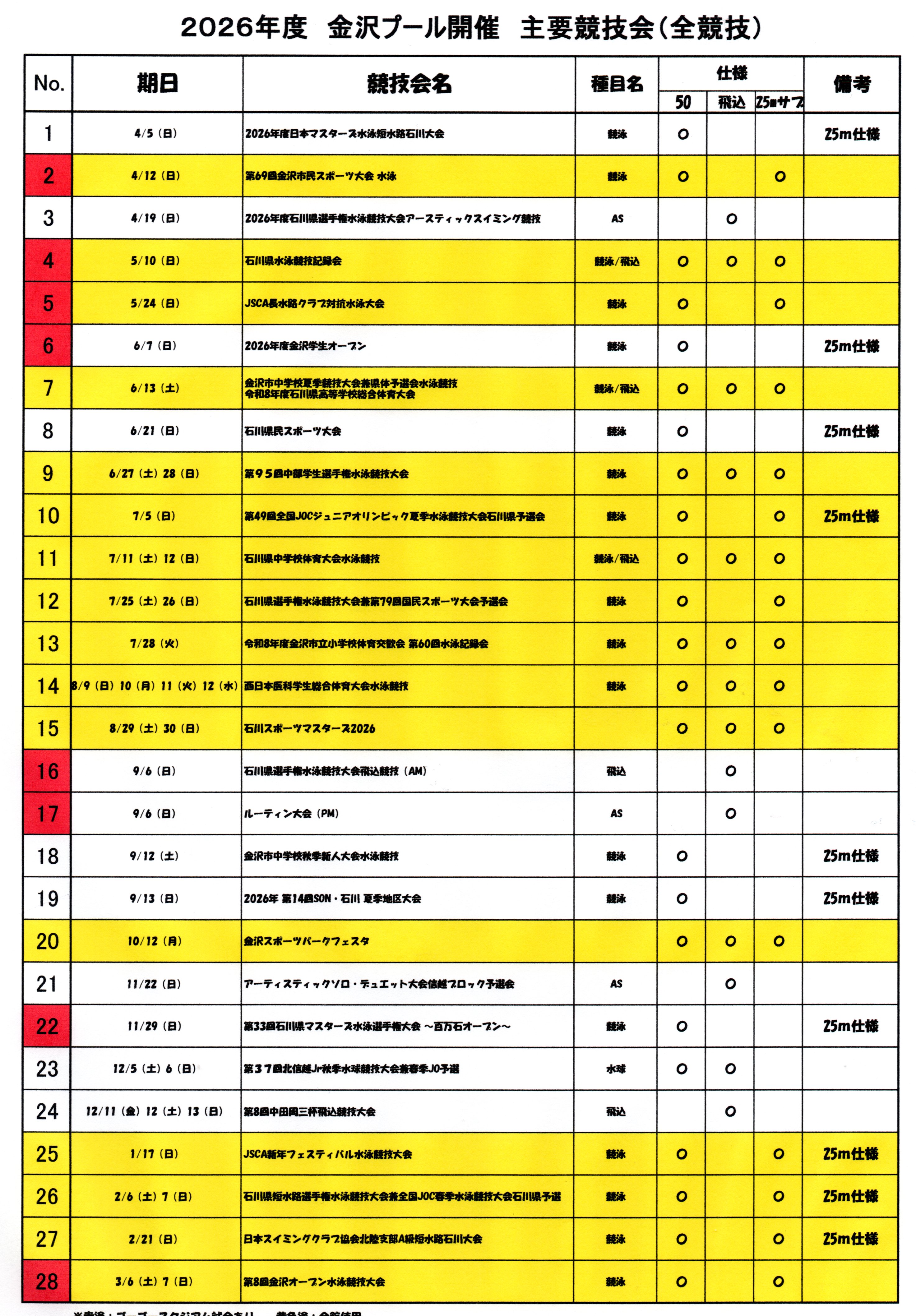 2026金沢プール競技日程表 PDF